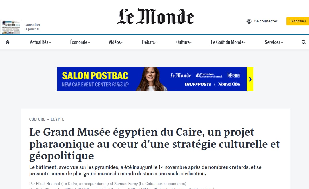 وتحت عنوان: "المتحف المصري الكبير في القاهرة... مشروع فرعوني في قلب الاستراتيجية الثقافية والجيوسياسية"، قالت صحيفة لوموند الفرنسية إن المبنى المطل على الأهرامات، سيفتتح اليوم السبت، بعد تأجيلات عديدة، ليقدم بوصفه أكبر متحف في العالم مخصص لحضارة واحدة.