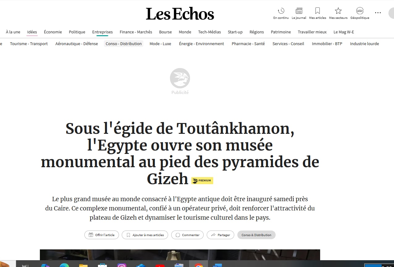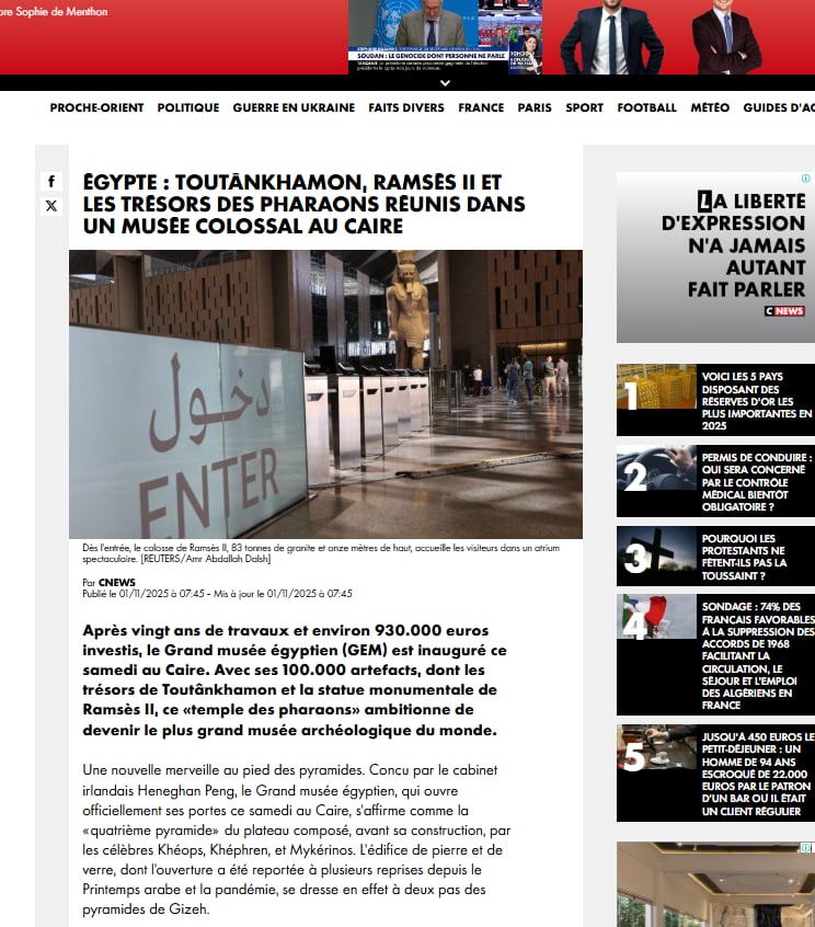 وقالت صحيفة ليزيكو، في تقرير موسع، بعنوان: "تحت راية توت عنخ آمون.. مصر تفتح متحفها الضخم عند سفح أهرامات الجيزة"، إن الاحتفالات امتدت 3 أيام بحضور مسئولين عالميين بينهم وزيرة الثقافة الفرنسية رشيدة داتي، مؤكدة أن المتحف يعرض كامل كنوز توت عنخ آمون، أكثر من 5 آلاف قطعة، وللمرة الأولى أمام الجمهور.