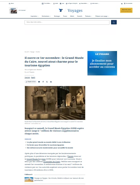 وتحت عنوان: يفتتح في الأول من نوفمبر: المتحف المصري الكبير.. سلاح جديد لسحر السياحة المصرية"، قالت صحيفة "لوفيجارو" الفرنسية إن المتحف الذي سيفتتح السبت يطمح لاستقطاب 7 ملايين زائر إضافي سنويًا، في خطوة تصفها الصحيفة بأنها رهان لإنعاش السياحة بعد سنوات من الاضطرابات السياسية والجائحة والتوترات الإقليمية.