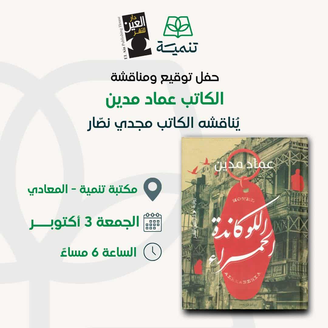 تنظم مكتبة تنمية المعادي، غدا الجمعة، حفل توقيع ومناقشة رواية "اللوكاندة الحمراء" للكاتب عماد مدين، وذلك في الساعة السادسة مساء، ويُناقشه الكاتب مجدي نصار.