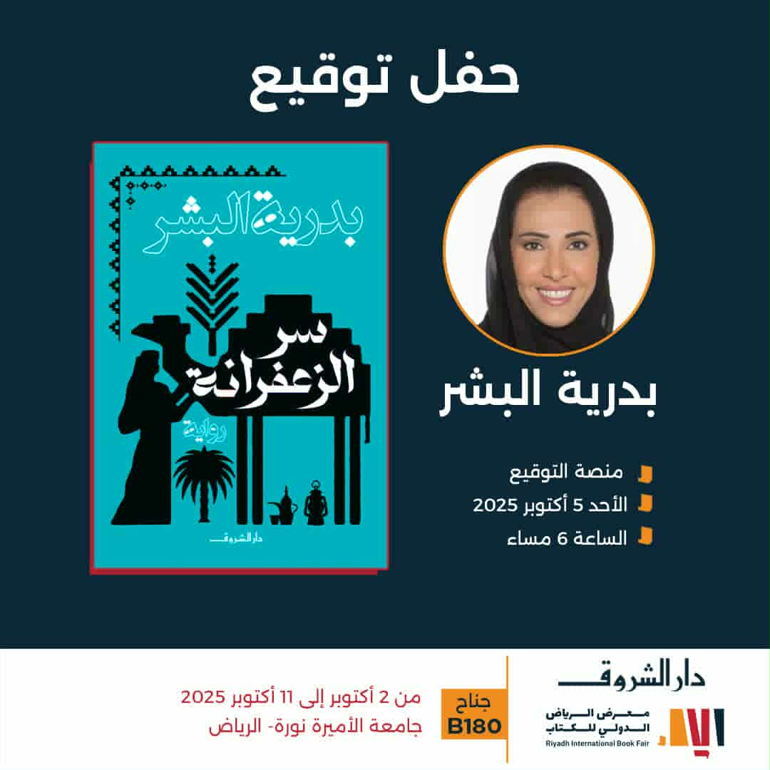 تشارك الكاتبة والروائية السعودية بدرية البشر في فعاليات معرض الرياض للكتاب 2025، حيث تلتقي قراءها في حفل توقيع لروايتها "سر الزعفرانة"، الصادرة حديثا عن دار الشروق.