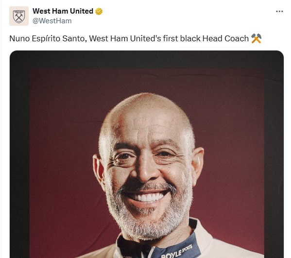 ونشر النادي اللندني تغريدة كتب فيها: "نونو إسبريتو، هو أول مدرب أسود يقود وست هام!"