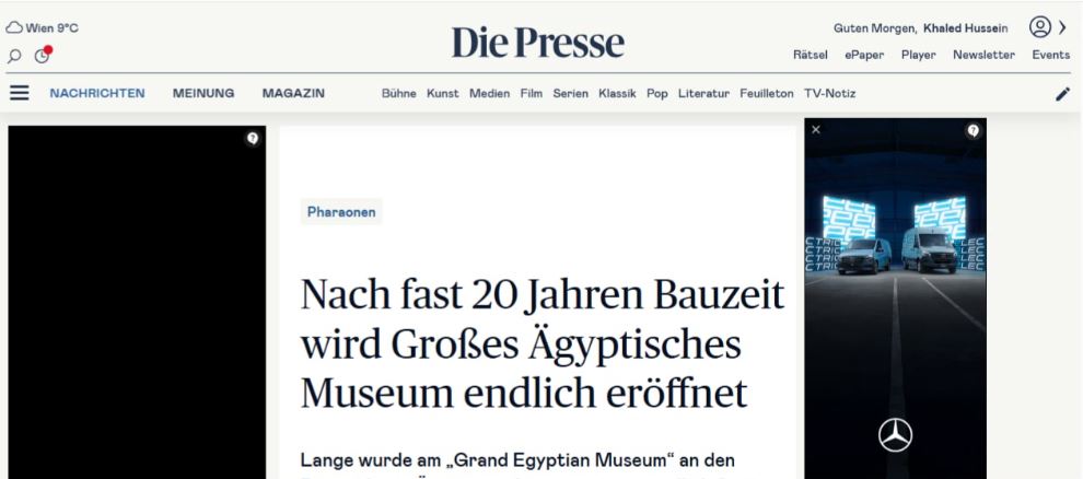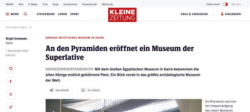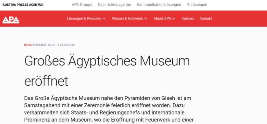 حظي الافتتاح الرسمي للمتحف المصري الكبير على هضبة الجيزة مساء السبت بتغطية واسعة واستثنائية في وسائل الإعلام النمساوية، التي وصفت الحدث بأنه «فصل جديد في التاريخ الإنساني» و«إنجاز معماري وثقافي من الطراز العالمي».