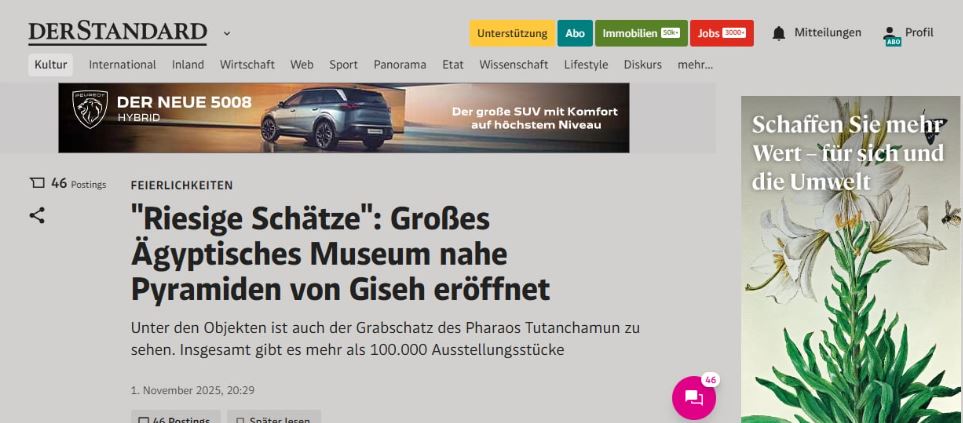 أما صحيفة دير شتاندارد فاختارت عنواناً يحمل دلالة ثقافية: «كنوز ضخمة: افتتاح المتحف المصري الكبير عند أهرامات الجيزة». وجاء في تقريرها أن «الافتتاح أُقيم في أجواء احتفالية مهيبة، بأضواء أهرامية ورقصات فرعونية»، وأضافت: «إنه حدث بمعايير فرعونية بالفعل».