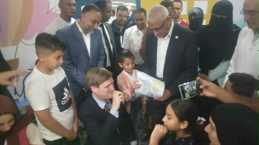 حرص أوسموند أوكروست، وزير التنمية الدولية بمملكة النرويج، اليوم الخميس، على مداعبة الأطفال الفلسطينيين داخل قاعة الدعم النفسي والترفيه بمستشفى العريش العام.