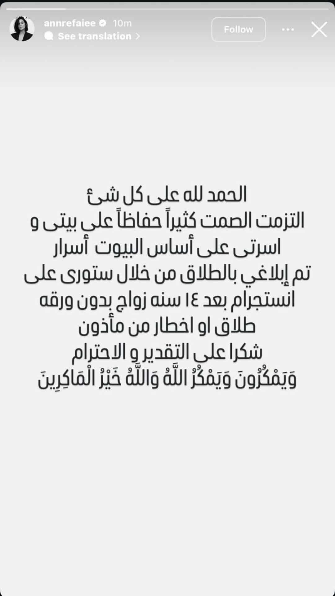 وكتبت آن من خلال خاصية "ستوري" عبر حسابها على "انستجرام": "الحمد لله على كل شيء، التزمت الصمت كثيرًا حفاظًا على بيتي وأسرتي، على أساس البيوت أسرار، تم إبلاغي بالطلاق من خلال ستوري على إنستجرام بعد 14 سنة زواج بدون ورقة طلاق أو إخطار من مأذون شكرا على التقدير والاحترام، وَيَمْكُرُونَ وَيَمْكُرُ اللَّهُ وَاللَّهُ خَيْرُ الْمَاكِرِينَ".