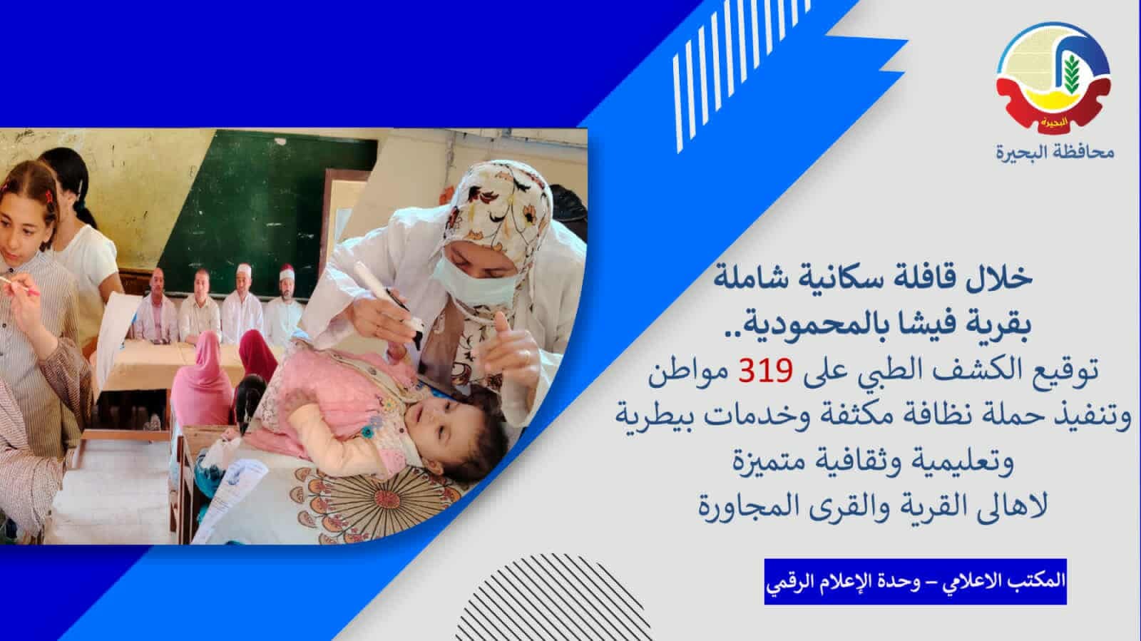 نظّمت وحدة السكان بديوان عام محافظة البحيرة، بالتنسيق مع وحدة السكان بمركز ومدينة المحمودية، قافلة سكانية شاملة بقرية فيشا، وذلك بمقر مدرسة الخزان الابتدائية.