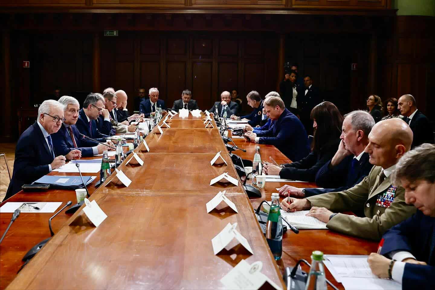 وحضر الاجتماع، آنا ماريا برنيني، وزيرة الجامعات والبحوث الإيطالية، وأورازيو سكيلاتشي وزير الصحة، ونيلو موسوميتشي، وزير الحماية المدنية والسياسات البحرية، وفرانشيسكو لولوبريجيدا، وزير الزراعة والسيادة الغذائية والغابات، وروبرتو كالديرولي، وزير الشئون الإقليمية والاستقلال، وممثلون عن وزارات الدفاع والتعليم.
