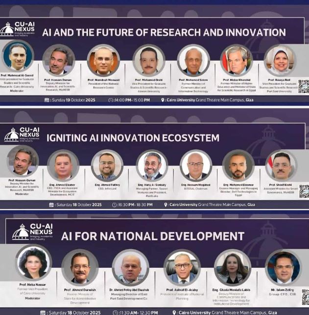 وتشهد الفعاليات، عقب الافتتاح، جلسة وزارية رفيعة المستوى بعنوان: "استشراف مستقبل الذكاء الاصطناعي في مصر" تديرها ا.د.هالة السعيد، مستشار رئيس الجمهورية للتنمية الاقتصادية، وبمشاركة ا.د.خالد عبد الغفار، نائب رئيس الوزراء لشئون التنمية البشرية، وا.د.أيمن عاشور وزير التعليم العالي والبحث العلمي، ود. عمرو طلعت وزير الاتصالات وتكنولوجيا المعلومات وم.محمد جبران وزير العمل، تليها جلسة نقاشية ثانية بعنوان "دور الذكاء الاصطناعي في التنمية الوطنية" تديرها الدكتورة هبة نصار نائب رئيس جامعة القاهرة الأسبق، بمشاركة نخبة من الخبراء تضم د.أشرف العربي ود.أحمد درويش وم.غادة لبيب ود.أحمد فكري عبد الوهاب وا.إسلام ذكري.