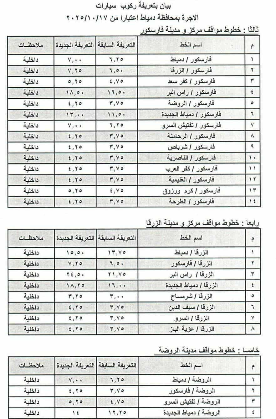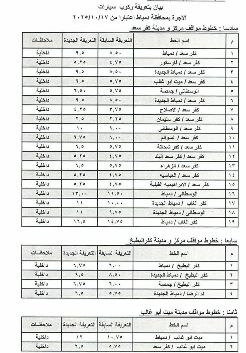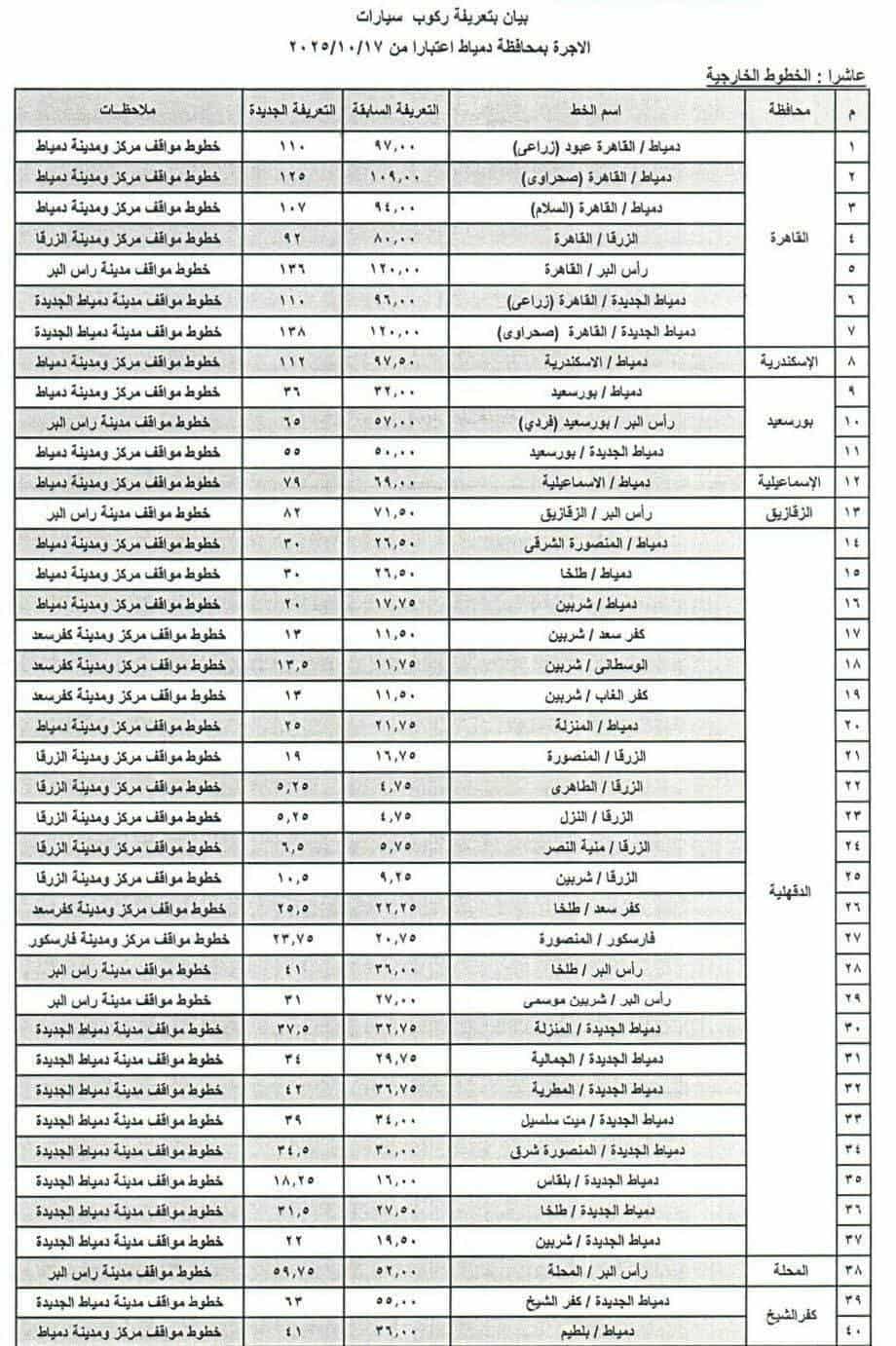 اعتمد الدكتور أيمن الشهابي، محافظ دمياط، تعديل تعريفة الركوب لسيارات الأجرة داخل المحافظة، بما في ذلك فتح عداد سيارات التاكسي، حيث أصبح سعر الكيلو الأول 13 جنيهًا بدلًا من 11.5 جنيه، والكيلو الذي يليه 3.75 جنيه بدلًا من 3.45 جنيه، وذلك عقب قرار لجنة التسعير التلقائي بتحريك أسعار المواد البترولية اعتبارًا من اليوم الجمعة.