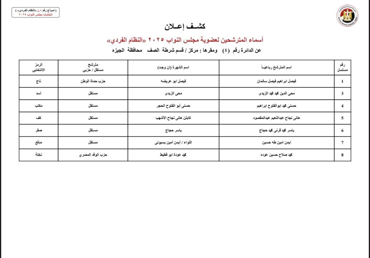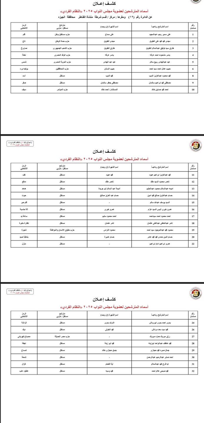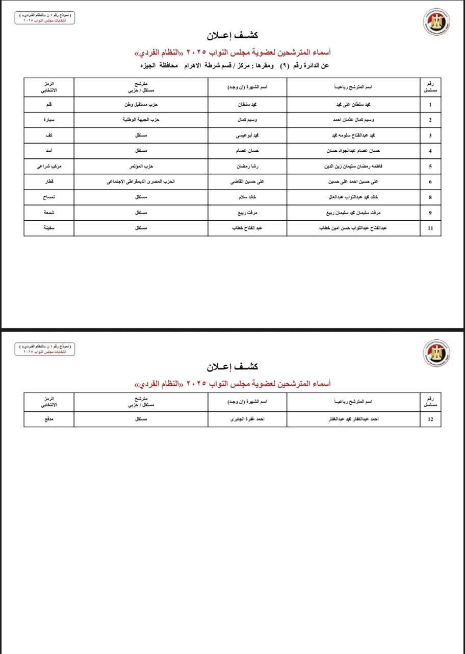 أعلنت الهيئة الوطنية للانتخابات عن الكشوف المبدئية لأسماء المرشحين في انتخابات مجلس النواب 2025 بالنظام الفردي بمحافظة الجيزة.