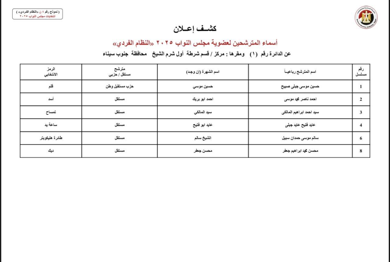 أعلنت الهيئة الوطنية للانتخابات عن الكشوف المبدئية لأسماء المرشحين في انتخابات مجلس النواب 2025 على النظام الفردي بمحافظة جنوب سيناء.