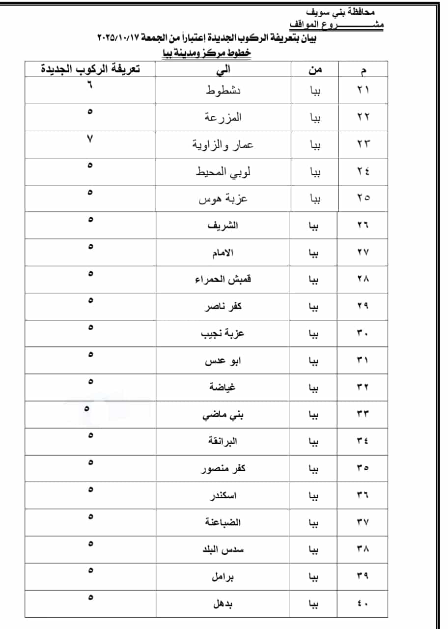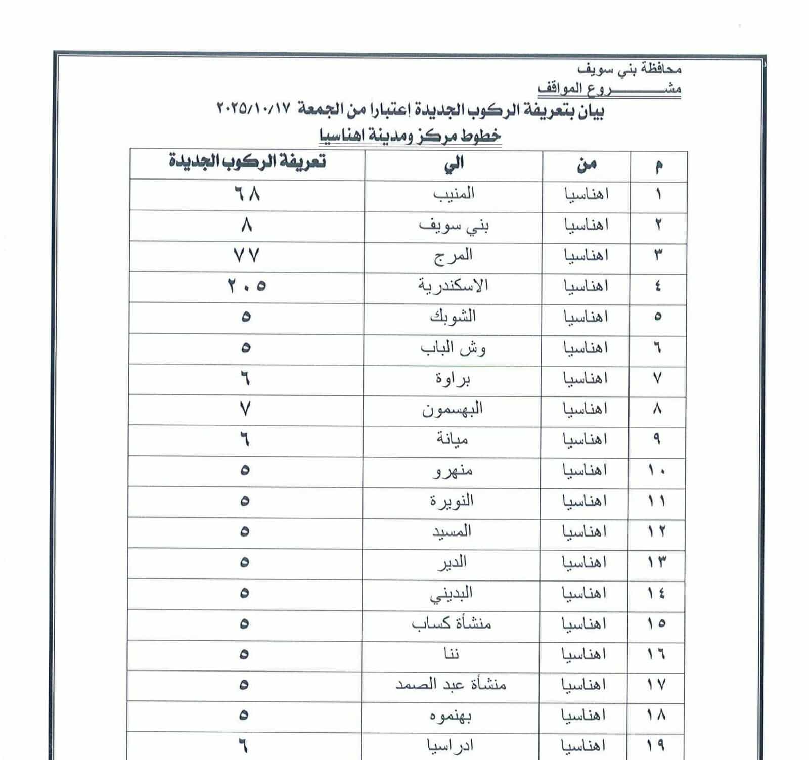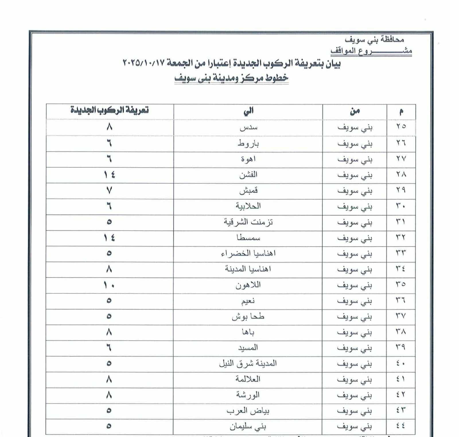 اعتمد الدكتور محمد هاني غنيم، محافظ بني سويف، التعريفة الجديدة للمواصلات الداخلية والخارجية لسيارات الأجرة والسرفيس والتاكسي داخل المحافظة وبين مراكزها الإدارية، وكذلك بين بني سويف والمحافظات الأخرى، وذلك عقب قرار الحكومة بتحريك أسعار المنتجات البترولية اعتبارًا من صباح اليوم الجمعة 17 أكتوبر 2025، مع تثبيت الأسعار داخل السوق المحلي لمدة عام كحد أدنى.