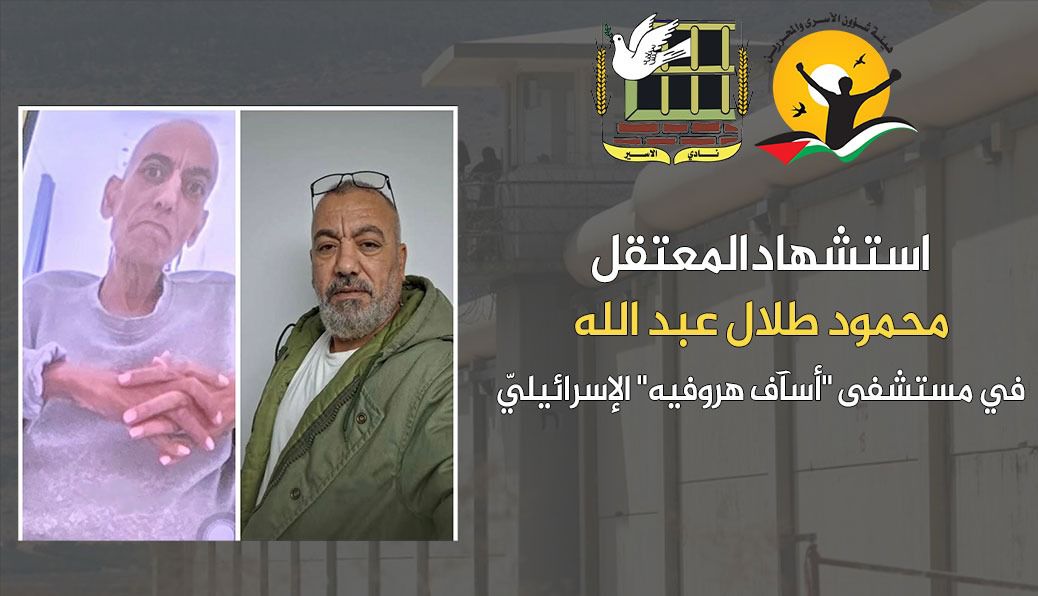 أبلغت الهيئة العامة للشئون المدنية، وهيئة شئون الأسرى والمحررين، ونادي الأسير الفلسطيني، باستشهاد المعتقل محمود طلال عبد الله (49 عاما) من مخيم جنين، في مستشفى «أساف هروفيه» الإسرائيلي.