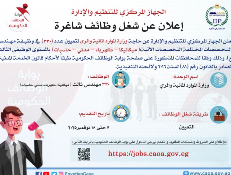 أعلن رئيس الجهاز المركزي للتنظيم والإدارة، المهندس حاتم نبيل، عن حاجة وزارة الموارد المائية والري لتعيين 330 في وظيفة مهندس بالتخصصات الآتية: (ميكانيكا – كهرباء – مدني – حاسبات) بالمستوى الوظيفي الثالث (ج)، وذلك وفقا للمحافظات المذكورة على صفحة بوابة الوظائف الحكومية طبقاً لأحكام قانون الخدمة المدنية الصادر بالقانون رقم (81) لسنة 2016 ولائحته التنفيذية.
