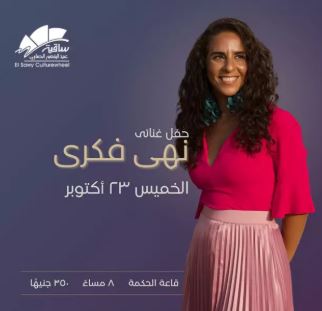 تحيي الفنانة نهى فكري، حفلًا غنائيًا في الثامنة مساء الخميس المقبل، على مسرح قاعة الحكمة بساقية عبد المنعم الصاوي.
