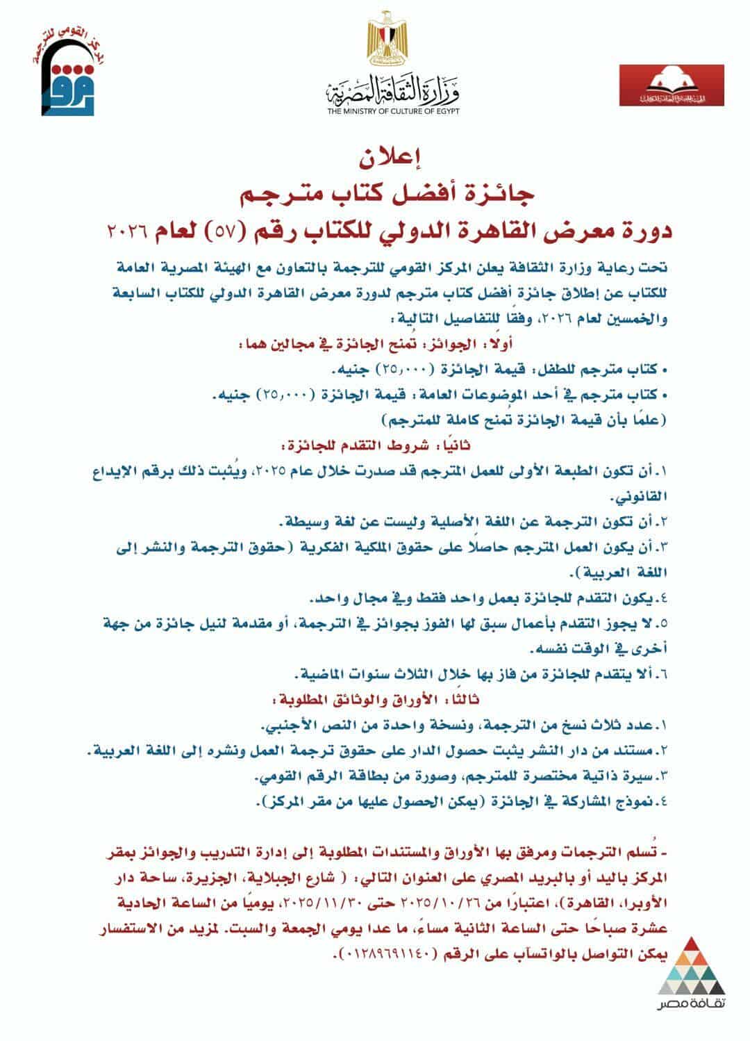 أعلن المركز القومي للترجمة بالتعاون مع الهيئة المصرية العامة للكتاب عن إطلاق جائزة أفضل كتاب مترجم لدورة معرض القاهرة الدولي للكتاب السابعة والخمسين لعام 2026.