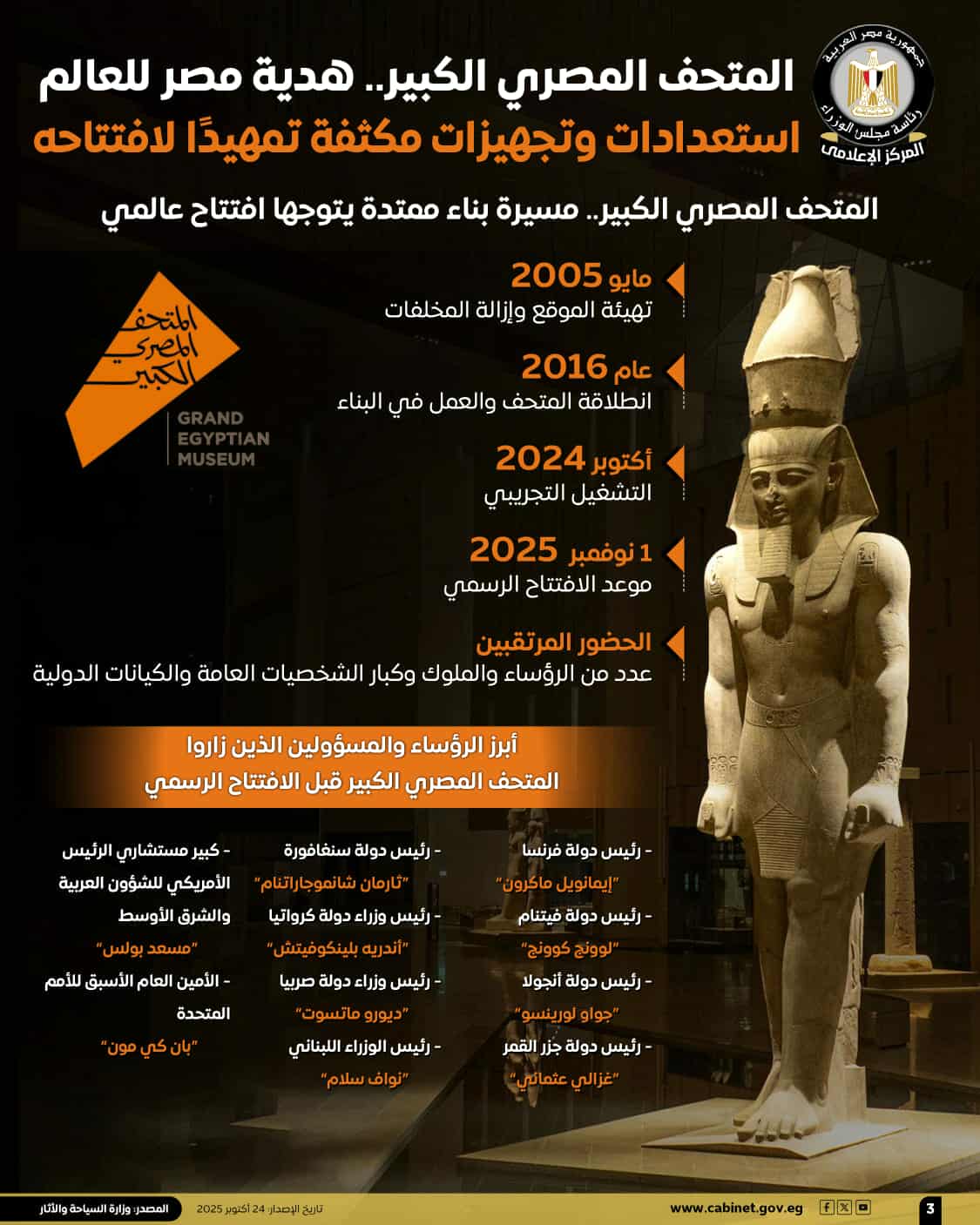 واستعرضت الإنفوجرافات مراحل إنشاء المتحف، حيث بدأ العمل في تهيئة الموقع وإزالة مخلفاته في مايو 2005، ثم انطلقت أعمال البناء عام 2016، ليتم تشغيله تجريبيًا في أكتوبر 2024، على أن يتم افتتاحه رسميًا في 1 نوفمبر 2025.