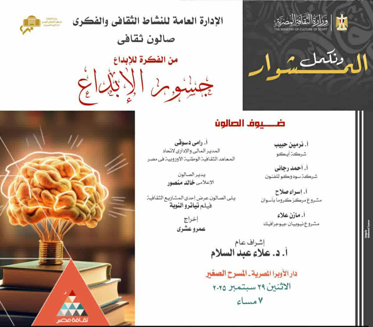 تنظم الإدارة العامة للنشاط الثقافي والفكري بدار الأوبرا المصرية، برئاسة الدكتور علاء عبد السلام، صالونًا ثقافيًا بعنوان "من الفكرة للإبداع – جسور الإبداع"، تحت رعاية وزارة الثقافة، وإشراف الأستاذة رشا الفقي، مدير عام الإدارة.